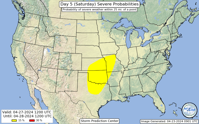 On Saturday, another area of low pressure emerges over the Southern Plains and takes a similar northeastward journey into the Midwest with another multi-day risk for severe weather. Saturday's risk may be highest in the Southern Plains with this second disturbance, but at least isolated severe storms should be possible further north and east along a stationary front extending from Kansas to Indiana. On Sunday, the severe weather risk shifts east but may extend along an impressed north-south line from Milwaukee to Waco.