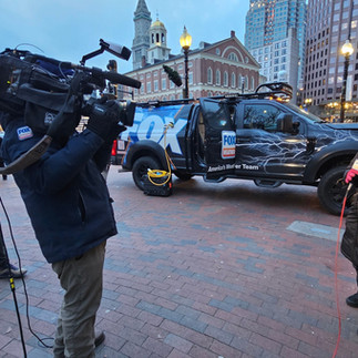 Jane, Lloyd and I met in the hotel coffee shop before loading into the FOX Weather Beast production truck. Jane was scheduled as a reporter today, so we would be much more mobile than yesterday. We knew we wanted to start the day close to the water, so we drove back to a spot I had taken some footage at the night before. Lloyd spotted an overhang that could give us cover and the harbor was choppy and splashing up onto the sidewalk. Our first hit was at 9:15a for FOX’s streaming-only news channel LIVE NOW. We had some nice snow ongoing, thankfully.